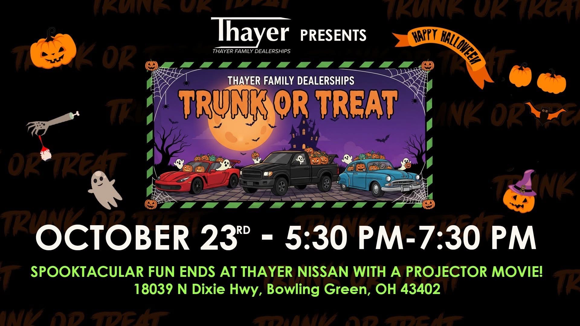 Hop from dealership to dealership for non-stop excitement! Trunk or treating events run through 7:30 PM, then head over to Thayer Nissan to snuggle up for the classic Nightmare Before Christmas (indoors, of course).